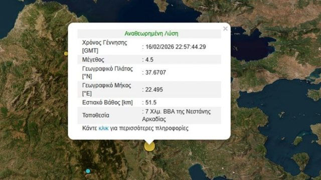 According to the Geodynamic Institute, the epicenter was located 7 kilometers north-northeast of Nestani, Arcadia, while the focal depth was estimated at 51.5 kilometers.