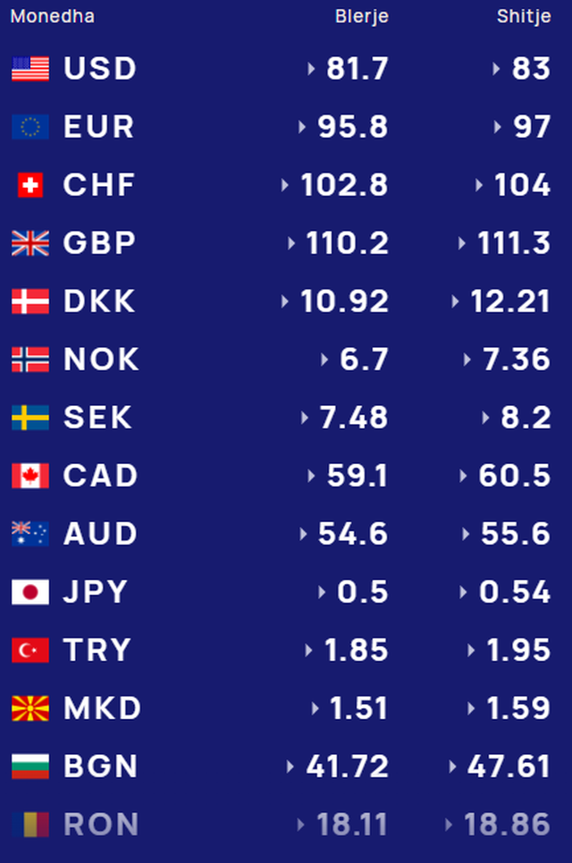 Për kursin e monedhave të tjera shihni tabelën e mëposhtme:
